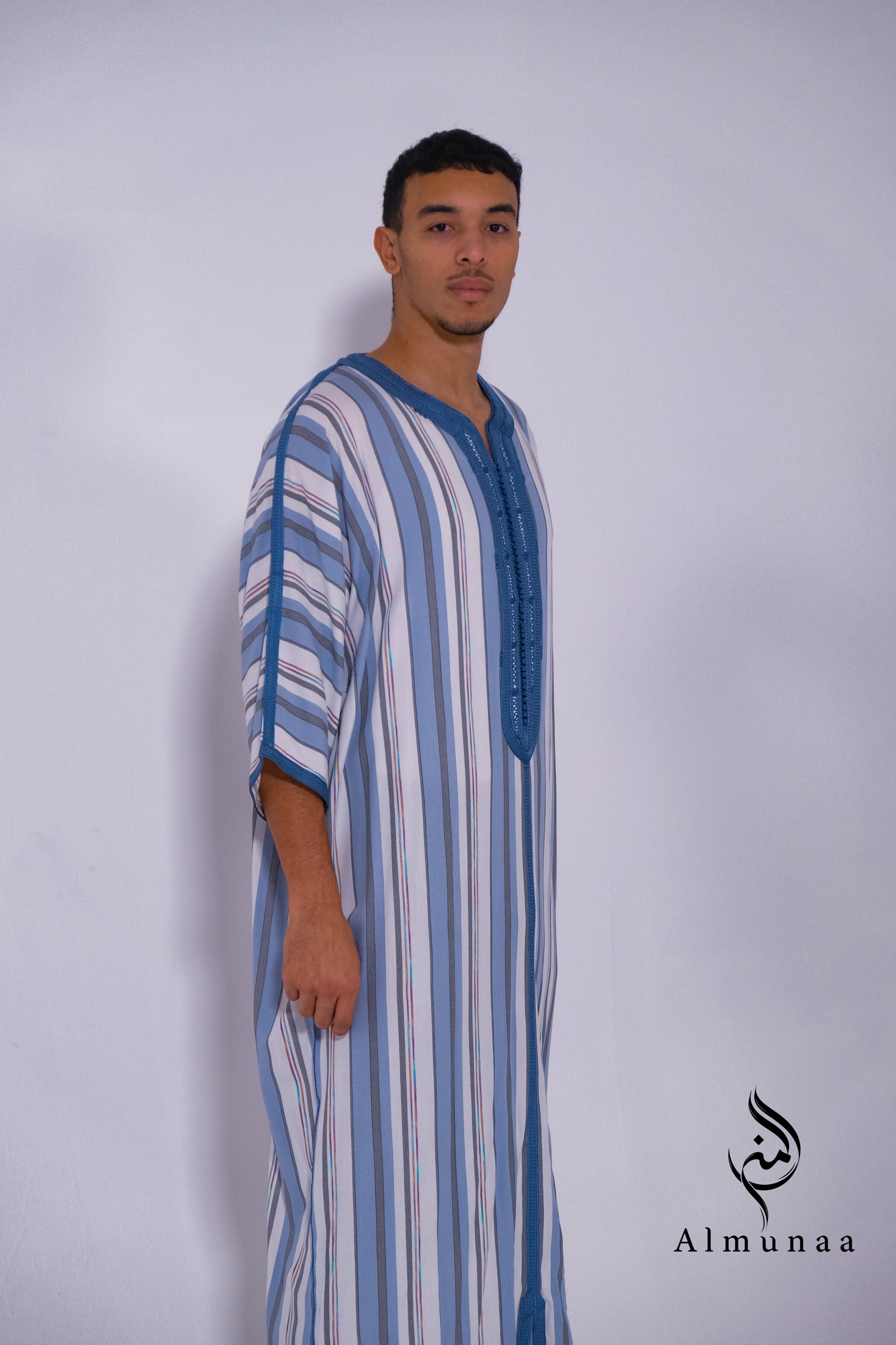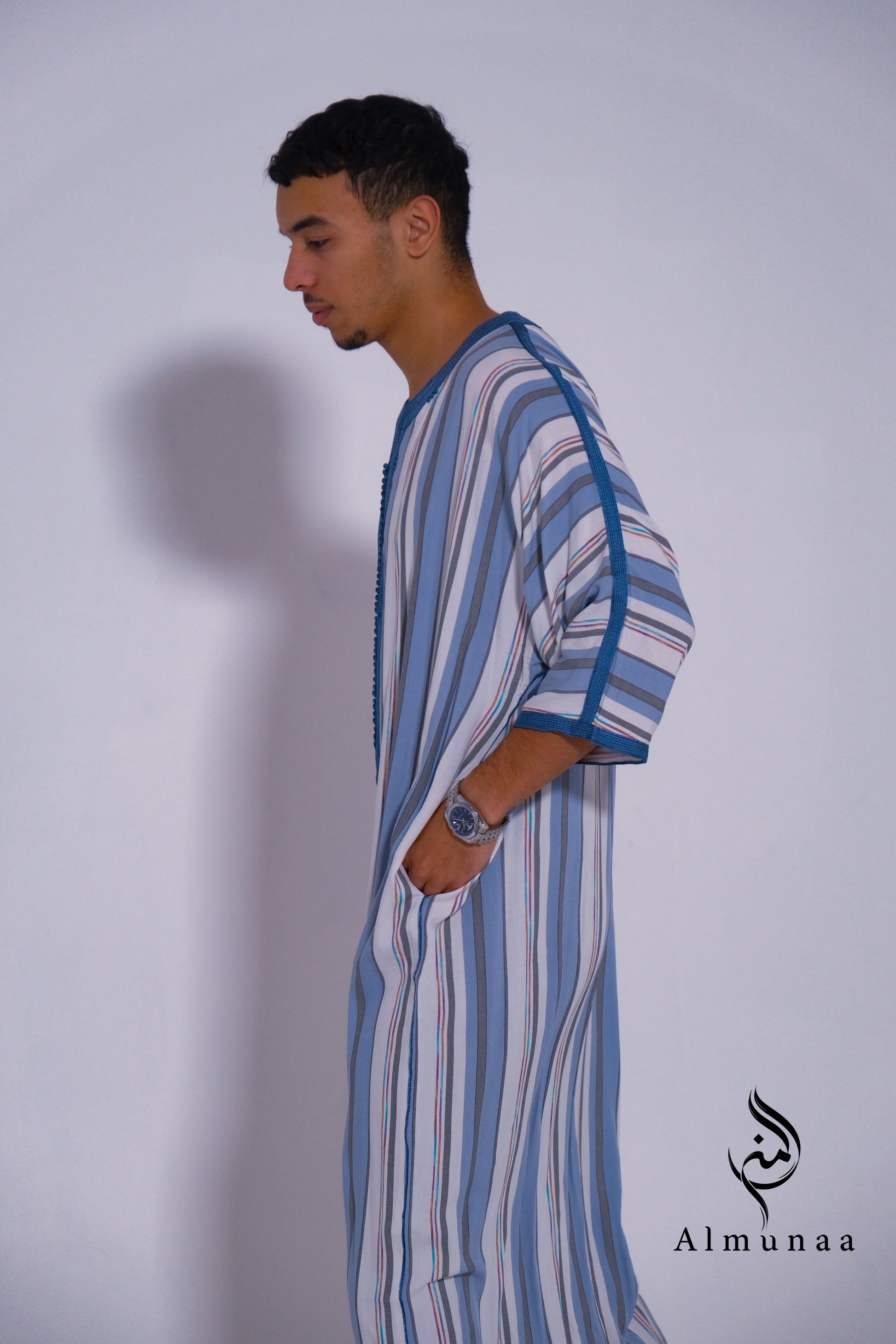 MENS Moroccan Cotton Summer Wedding KAFTAN DRESS – Minimalist Blue Stripes Kaftan Dress Available In Multiple Sizes